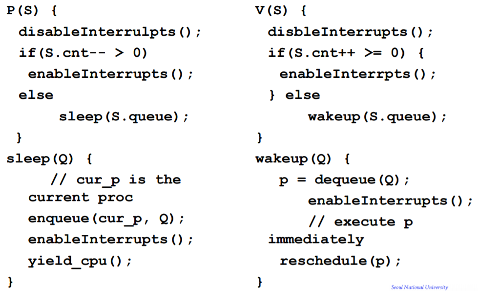 * Multiprocessor 환경에서는 Semaphore (Interrupt disable)을 통한 synchronization 어려움