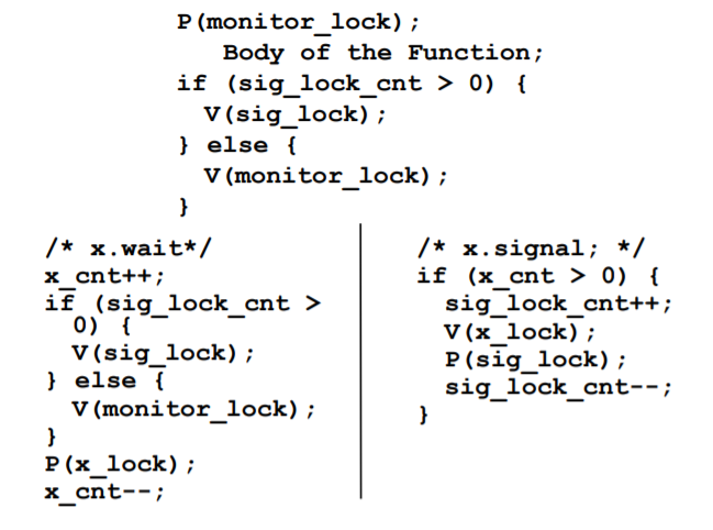 * 3개의 queue 존재 : monitor_lock, x_lock, sig_lock (Hoare style monitor에서 signal을 보낸 프로세스가 밖에서 대기하기 위해)